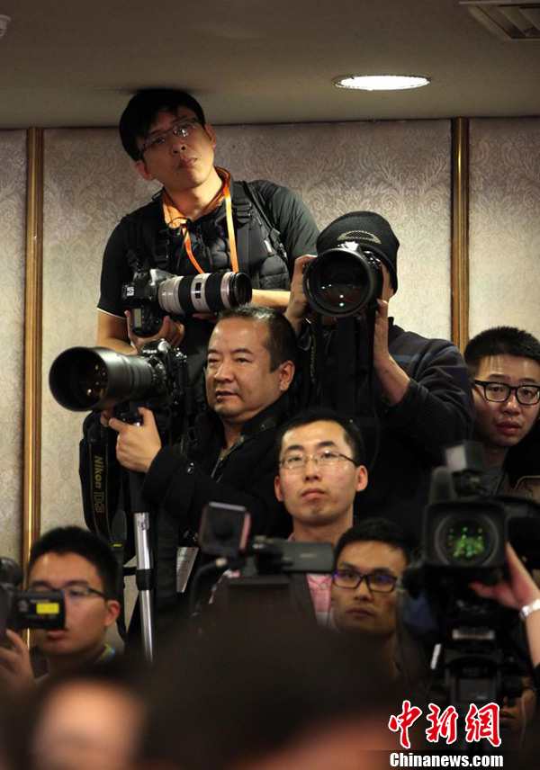 3月2日,政协新闻发布会上,摄影记者在狭小的空间内头顶天花板工作。田贺 摄 图片来源:CFP视觉中国