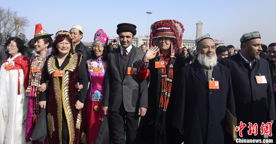 3月3日,全国政协十二届一次会议在北京开幕,各民族委员一同步入会场。中新社发 侯宇 摄
