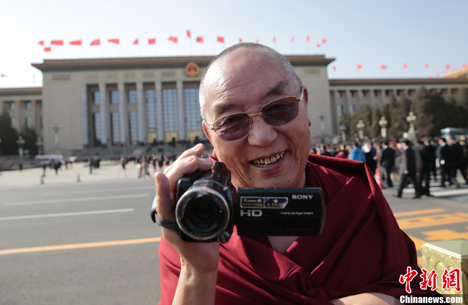 3月3日下午,全国政协十二届一次会议在北京人民大会堂隆重开幕,各路媒体云集人民大会堂前采访报道会议。全国政协委员宗洛·向巴克珠(藏族)在广场上客串记者,拿着DV拍不停。中新社发 杜洋 摄