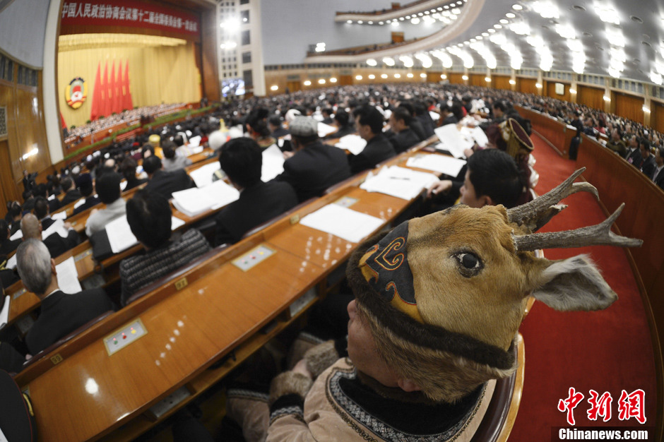 3月3日下午,中国人民政治协商会议第十二届全国委员会第一次会议在北京人民大会堂开幕。一名少数民族委员头戴民族特色帽子参会。中新社发 廖攀 摄