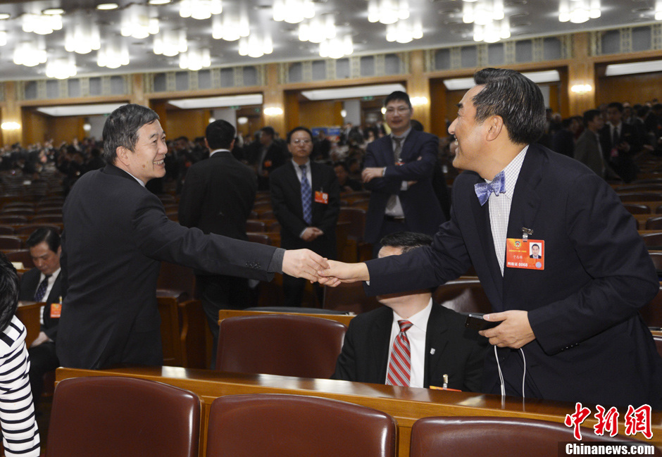 3月3日,中国人民政治协商会议第十二届全国委员会第一次会议在北京人民大会堂开幕。国侨办副主任任启亮(左)参加会议时,问候列席会议的海外华侨。中新社发 廖攀 摄