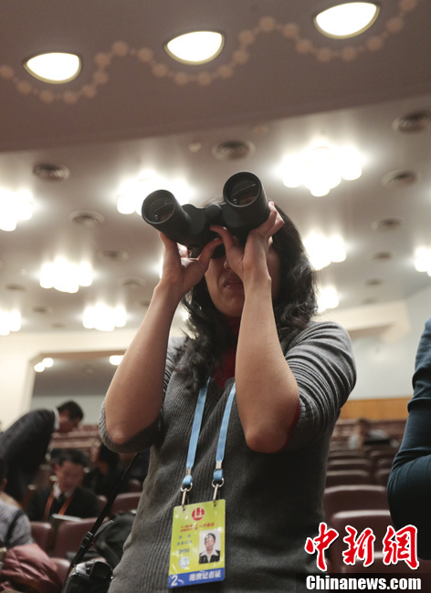 3月3日下午,全国政协十二届一次会议在人民大会堂开幕,各路媒体云集人民大会堂报道盛会。图为一女记者自带望远镜观看开幕会。中新社发 杜洋 摄