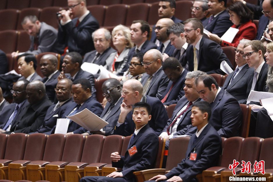 3月3日下午3时,全国政协十二届一次会议在人民大会堂举行开幕会,听取政协全国委员会常务委员会工作报告,听取政协全国委员会常务委员会关于提案工作情况的报告。图为外国驻华使节旁听会议。中新社发 杜洋 摄