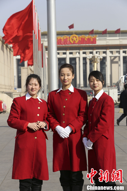 3月3日下午,全国政协十二届一次会议在北京人民大会堂隆重开幕,靓丽的女服务员合影留念。中新社发 赵隽 摄
