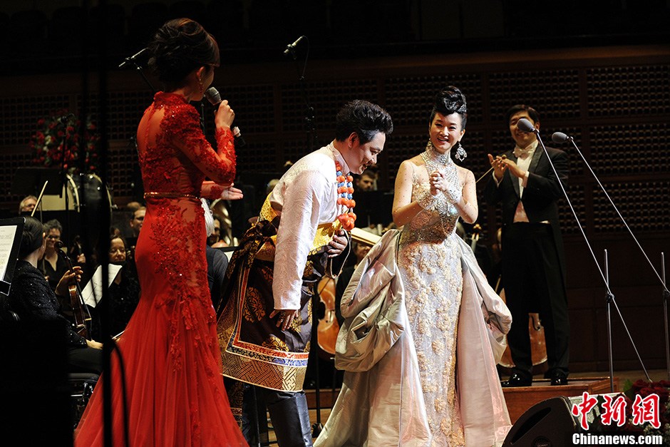 当地时间3月3日晚,美国旧金山戴维斯交响乐厅,宋祖英美国音乐会圆满结束。这是中国国侨办“文化中国 四海同春”首次以个人音乐会形式在美国举行慰侨活动,自2月16日起,宋祖英先后在纽约、华盛顿、洛杉矶和旧金山与美国交响乐团和合唱团合作了4场音乐会。图为泽旺多吉(左二)与宋祖英合唱。中新社发 陈钢 摄