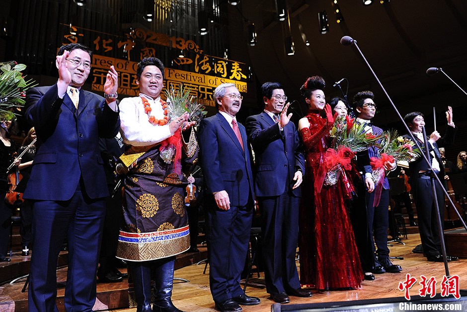 当地时间3月3日晚,美国旧金山戴维斯交响乐厅,宋祖英美国音乐会圆满结束。这是中国国侨办“文化中国 四海同春”首次以个人音乐会形式在美国举行慰侨活动,自2月16日起,宋祖英先后在纽约、华盛顿、洛杉矶和旧金山与美国交响乐团和合唱团合作了4场音乐会。图为中国驻旧金山总领事高占生(左4)、旧金山市长李孟贤(左3)等上台与演员们一起向观众问好。中新社发 陈钢 摄