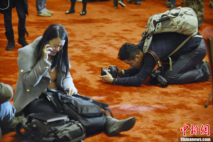 3月4日,北京,十二届全国人大一次会议在人民大会堂举行新闻发布会,上会记者投入两会报道工作。图为记者们或坐或趴在红地毯上忙碌着。江心 摄 图片来源:CFP视觉中国
