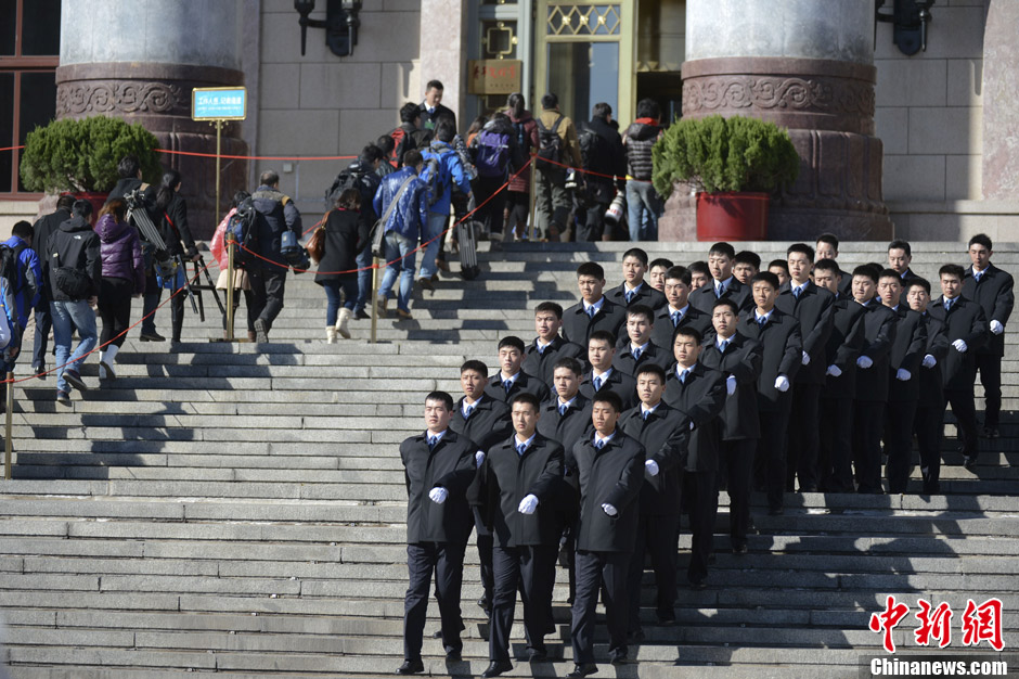 3月4日,十二届全国人大一次会议在北京人民大会堂举行新闻发布会。入场时,记者与安保人员各行其道。中新社发 廖攀 摄