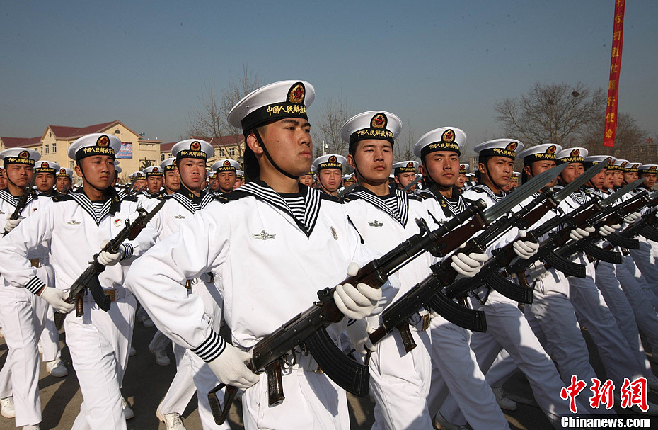 3月4日上午,中国海军北海舰队在某训练基地隆重举行2013年新兵入伍训练结业阅兵典礼,向军地领导汇报训练成果。在 “八一”军旗的引导下,18个方队的2000余名新兵以昂扬的精神状态一一通过检阅台。他们以严明的纪律、响亮的口号、整齐的动作、昂扬的士气,向祖国和人民交出了一份合格答卷。中新社发 徐崇德 摄