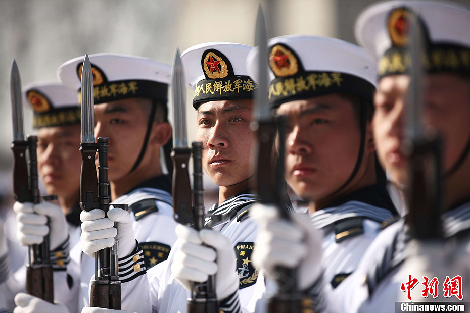 3月4日上午,中国海军北海舰队在某训练基地隆重举行2013年新兵入伍训练结业阅兵典礼,向军地领导汇报训练成果。在 “八一”军旗的引导下,18个方队的2000余名新兵以昂扬的精神状态一一通过检阅台。他们以严明的纪律、响亮的口号、整齐的动作、昂扬的士气,向祖国和人民交出了一份合格答卷。中新社发 徐崇德 摄