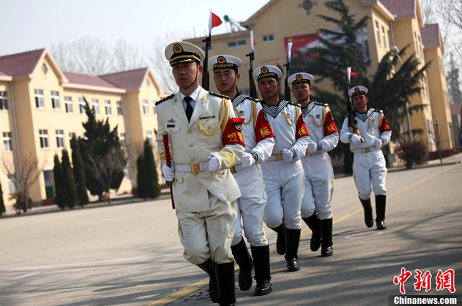 3月4日上午,中国海军北海舰队在某训练基地隆重举行2013年新兵入伍训练结业阅兵典礼,向军地领导汇报训练成果。在 “八一”军旗的引导下,18个方队的2000余名新兵以昂扬的精神状态一一通过检阅台。他们以严明的纪律、响亮的口号、整齐的动作、昂扬的士气,向祖国和人民交出了一份合格答卷。中新社发 徐崇德 摄