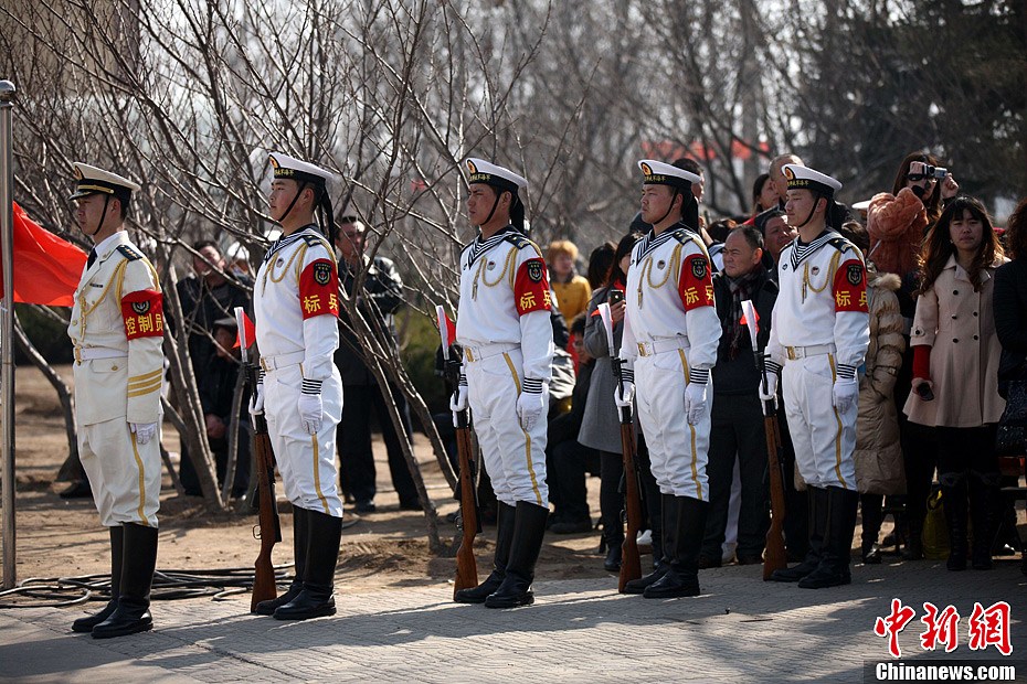 3月4日上午,中国海军北海舰队在某训练基地隆重举行2013年新兵入伍训练结业阅兵典礼,向军地领导汇报训练成果。在 “八一”军旗的引导下,18个方队的2000余名新兵以昂扬的精神状态一一通过检阅台。他们以严明的纪律、响亮的口号、整齐的动作、昂扬的士气,向祖国和人民交出了一份合格答卷。中新社发 徐崇德 摄