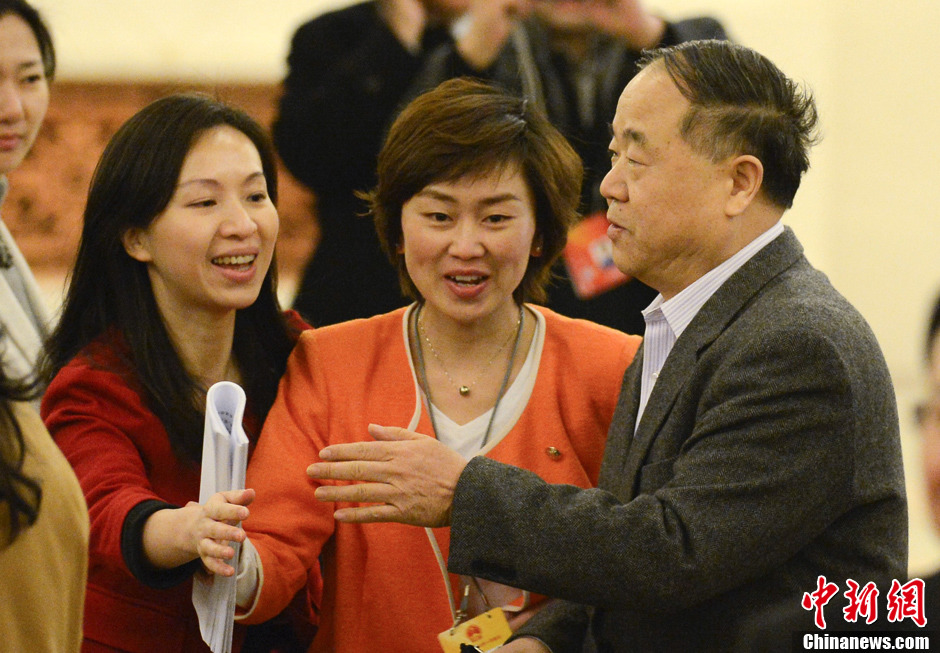 3月5日,十二届全国人大一次会议开幕在北京开幕,全国政协委员、诺贝尔文学奖得主莫言前往列席旁听,途中被美女记者“拦截”,莫言婉拒采访。中新社发 侯宇 摄