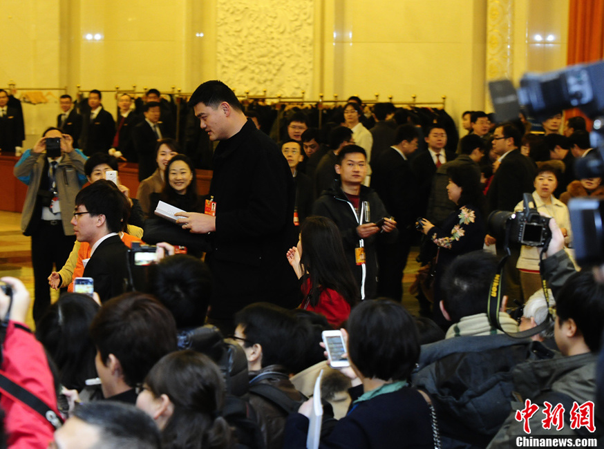 月5日上午,第十二届全国人民代表大会第一次会议在北京人民大会堂开幕。姚明列席会议,途中被几名美女记者“拦截”要求接受采访,他埋头沉默迅速通过。中新社发 侯宇 摄
