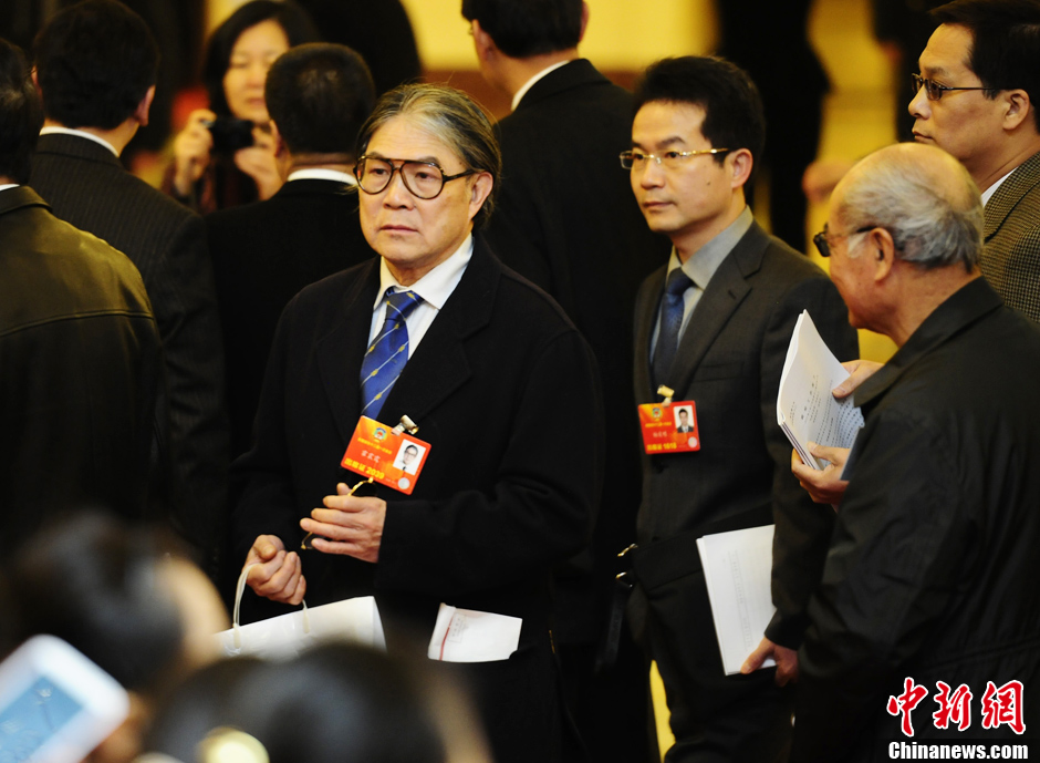 3月5日上午,第十二届全国人民代表大会第一次会议在北京人民大会堂开幕,全国政协委员霍震霆(左)列席会议。中新社发 侯宇 摄