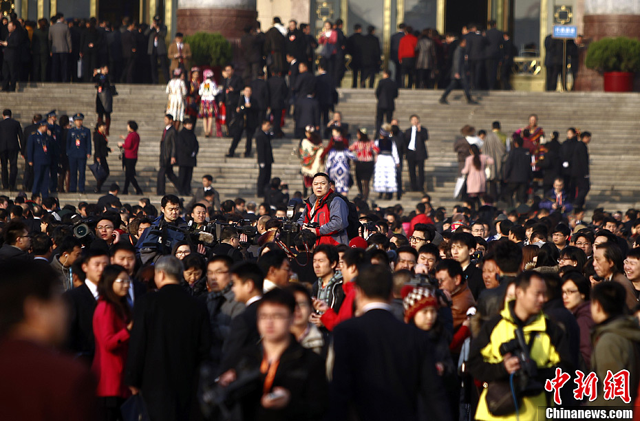 3月5日上午,第十二届全国人民代表大会第一次会议在北京人民大会堂开幕。一名摄影记者站在梯子上,在人流中寻觅拍摄目标。中新社发 张浩 摄