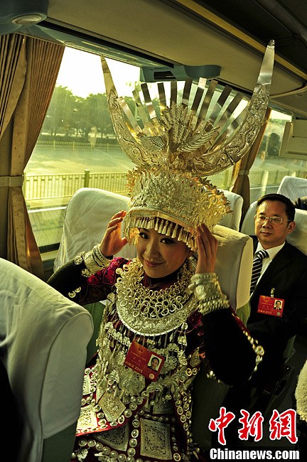3月5日上午,第十二届全国人民代表大会第一次会议在北京人民大会堂开幕。图为身穿苗族盛装的全国人大代表雷艳正在整理着装。中新社发 张伟 摄