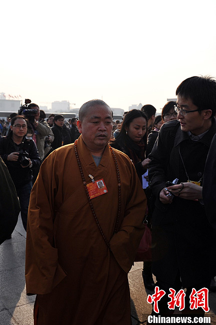 3月5日上午,第十二届全国人民代表大会第一次会议在北京人民大会堂开幕。全国人大代表、少林寺方丈释永信被记者紧追。中新社发 刘占昆 摄