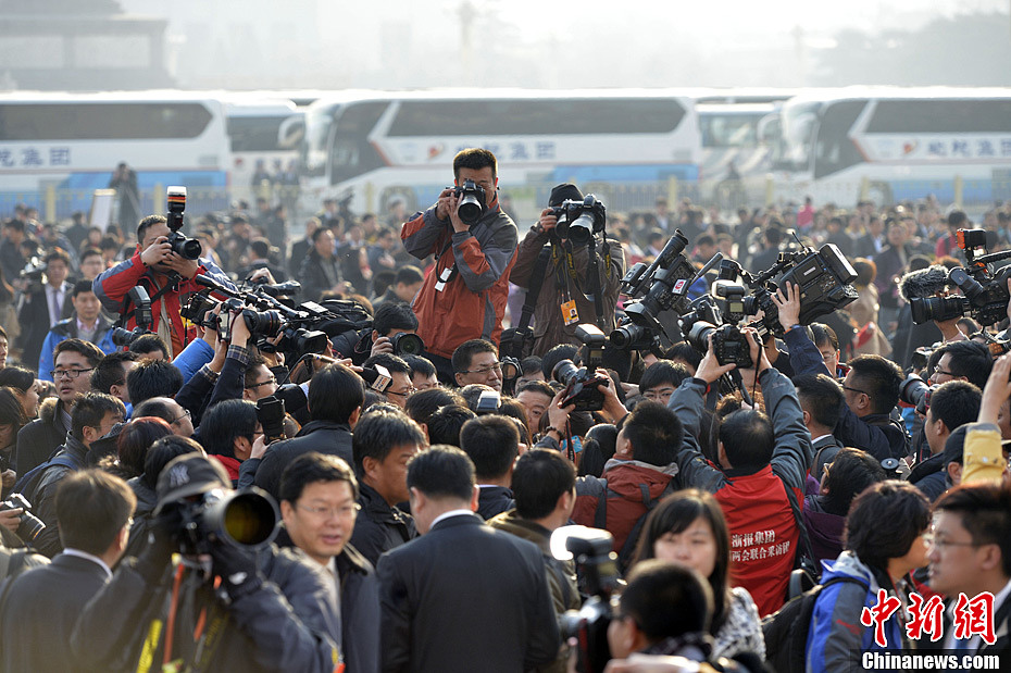 3月5日上午,第十二届全国人民代表大会第一次会议在北京人民大会堂开幕。海内外媒体记者聚集在人民大会堂东门外采访,新闻大战达到高潮。中新社发 韦亮 摄
