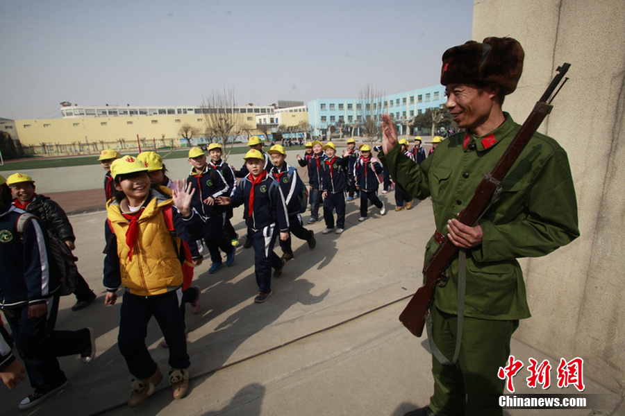 2013年3月5日,在山东济南黄台小学,一名家长扮演成“雷锋”为学生安全保驾护航。宋师傅借助3月5日学雷锋日,身穿军装,头戴东北帽,手握“冲锋枪”来到学校为600名学生的安全站岗,他说:“最近湖北发生校园踩踏事件,以及前段时间的校园砍伤事件等事故的频发,自发去学校为孩子们的安全护航。希望通过这种形式呼吁 社会各界来关心学生的安全。陈宁 摄 图片来源:东方IC 版权作品 请勿转载