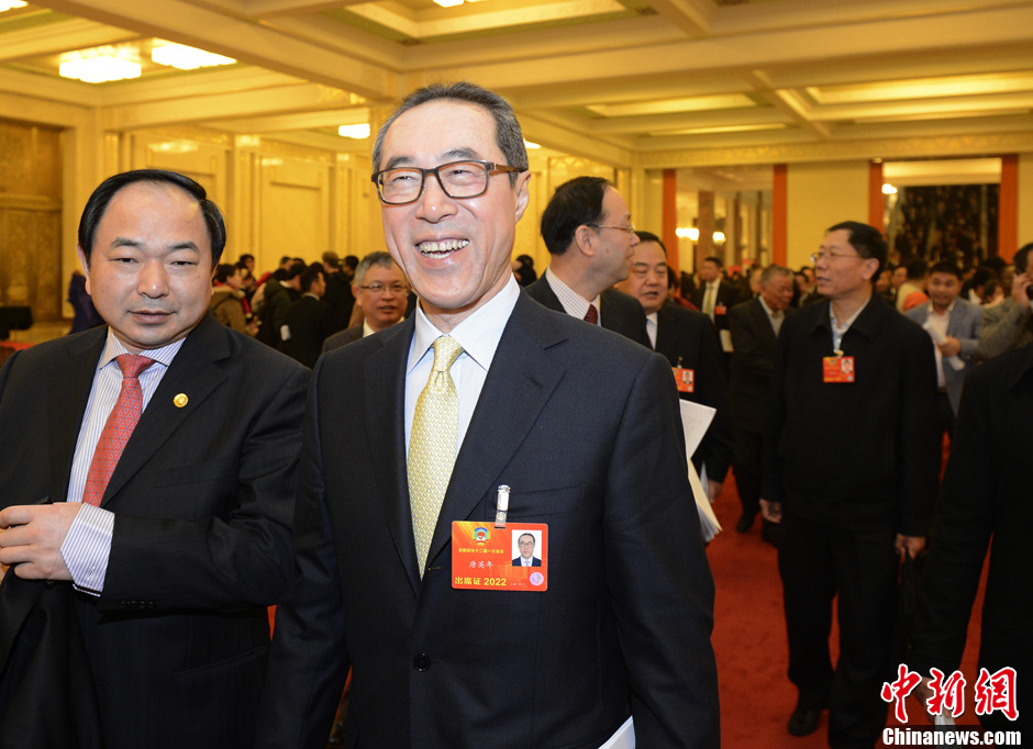 3月5日上午,第十二届全国人民代表大会第一次会议在北京人民大会堂开幕,全国政协主席团成员、香港特别行政区前政务司司长唐英年(右)会后表示,政府工作报告“很振奋”。中新社发 侯宇 摄
