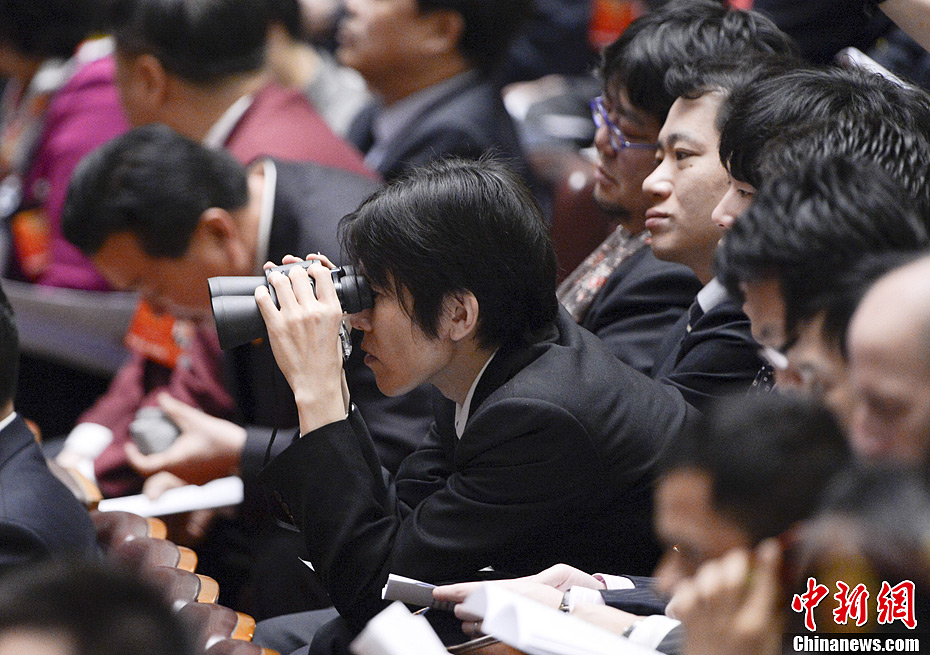 3月5日,第十二届全国人民代表大会第一次会议在北京人民大会堂开幕。与会者用望远镜观望主席台。中新社发 廖攀 摄