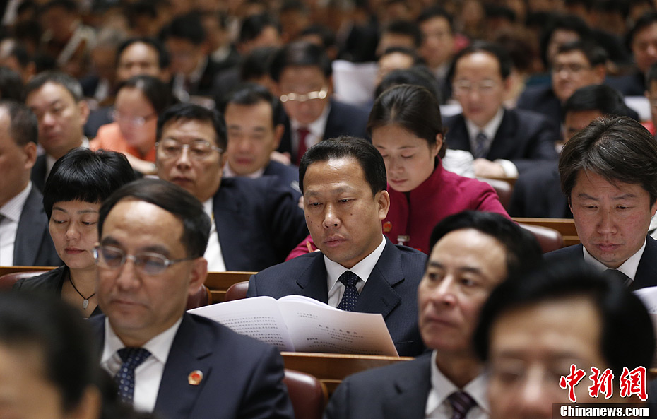 3月5日上午,第十二届全国人民代表大会第一次会议在北京人民大会堂开幕,全国人大代表、湖北黄冈市市委书记刘雪荣听取政府工作报告。中新社发 盛佳鹏 摄