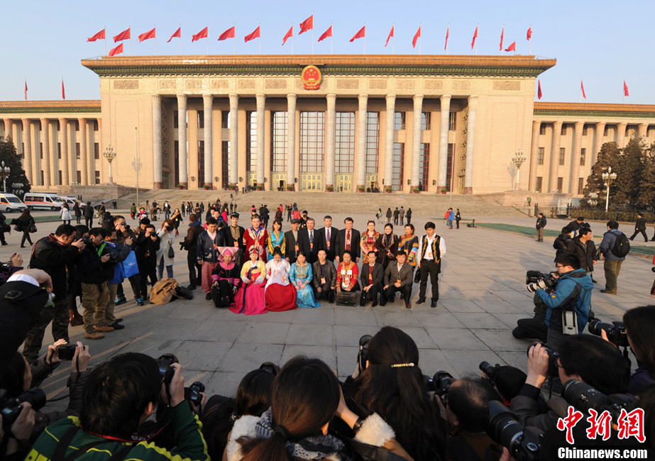 3月5日,十二届全国人大一次会议在北京人民大会堂开幕,负责民族语言翻译的工作人员吸引媒体记者狂拍。中新社发 刘忠俊 摄