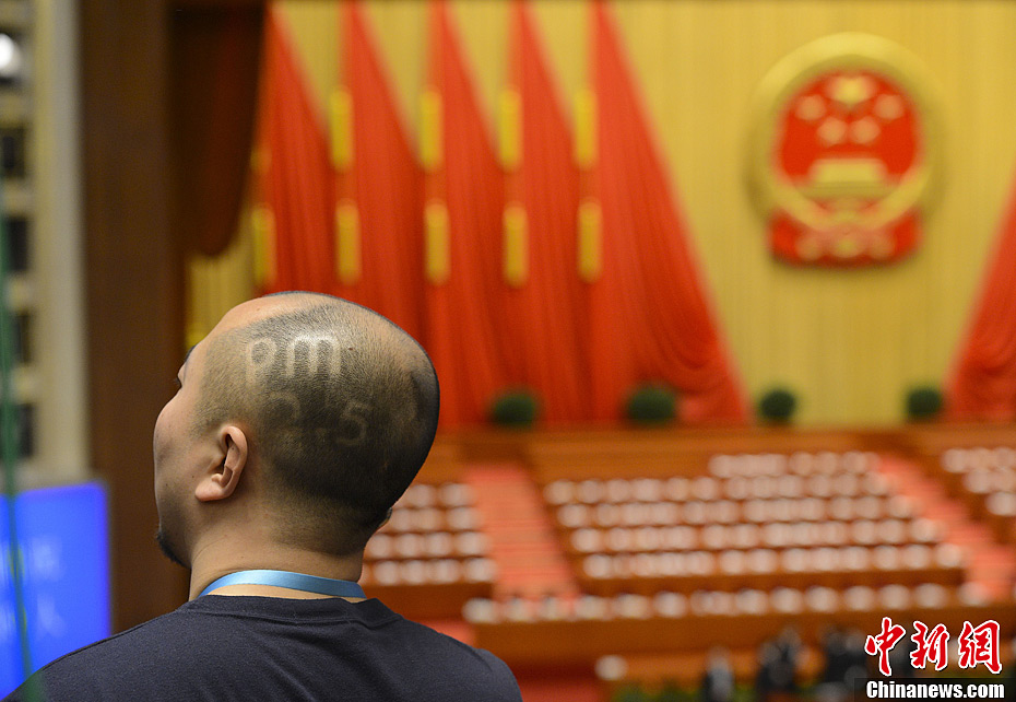 3月5日上午,第十二届全国人民代表大会第一次会议在北京人民大会堂开幕,一名记者头顶纹上“PM2.5”上会。中新社发 刘震 摄