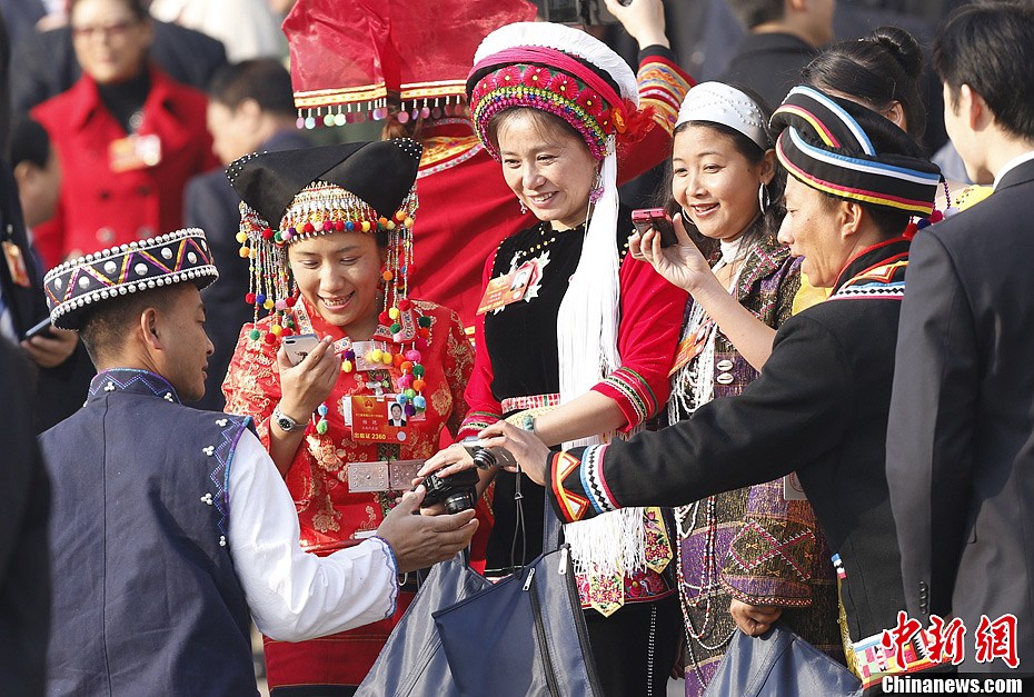 3月5日上午,第十二届全国人民代表大会第一次会议在北京人民大会堂开幕。少数民族代表纷纷拿出自己的相机拍纪念照。中新社发 杜洋 摄