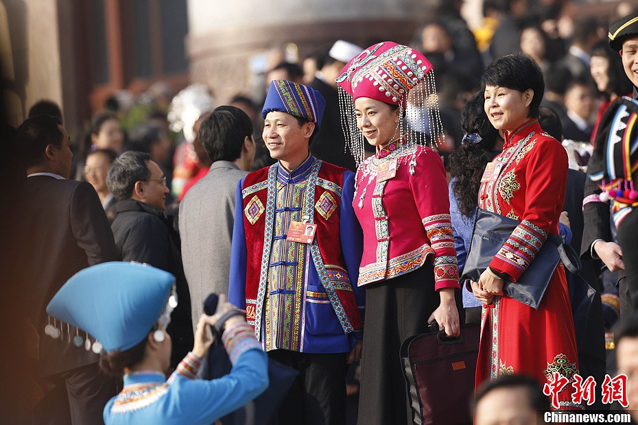3月5日上午,第十二届全国人民代表大会第一次会议在北京人民大会堂开幕。少数民族代表盛装出席。中新社发 杜洋 摄
