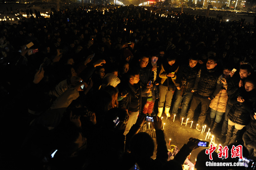 吉林省警方在5日晚间发布消息,称“3·04”失踪案的嫌犯已经投案落网,但婴儿已遭嫌犯掐死并抛尸雪中。当晚21时开始,长春数千市民自发聚集在文化广场,点燃蜡烛悼念这位不幸遇难的2月大男婴小皓博。张瑶 摄