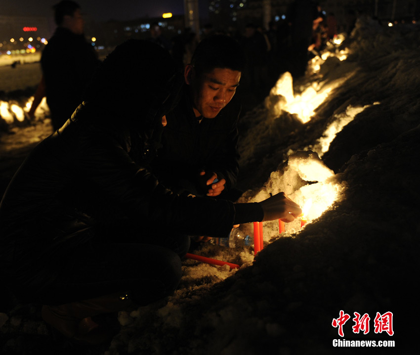 吉林省警方在5日晚间发布消息,称“3·04”失踪案的嫌犯已经投案落网,但婴儿已遭嫌犯掐死并抛尸雪中。当晚21时开始,长春数千市民自发聚集在文化广场,点燃蜡烛悼念这位不幸遇难的2月大男婴小皓博。张瑶 摄