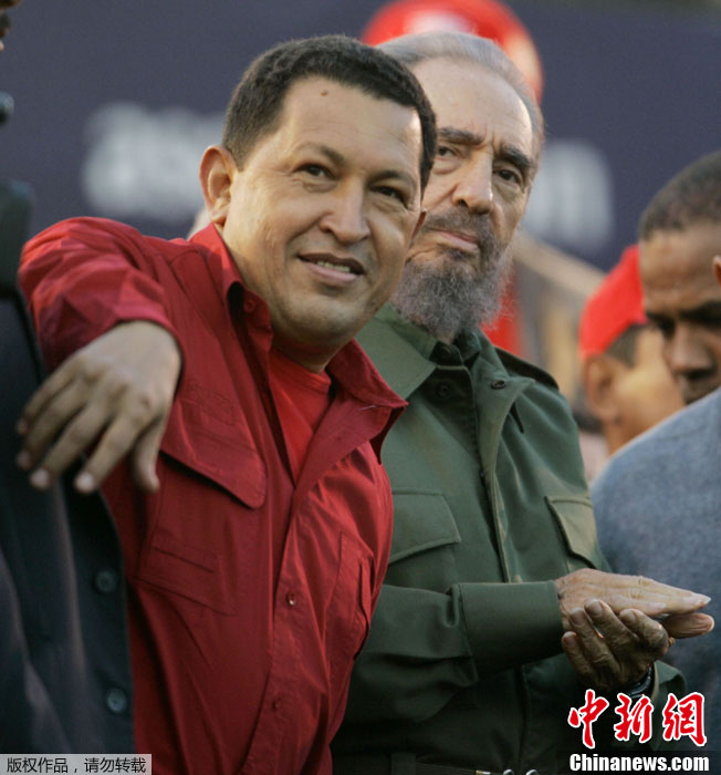 当地时间3月5日,委内瑞拉副总统马杜罗宣布,该国总统查韦斯于当天16时25分去世。乌戈·查韦斯是委内瑞拉第53任总统。他1954年7月28日出生于委内瑞拉巴里纳斯州,结过两次婚,育有一子三女。图为2006年7月21日,阿根廷科尔多瓦,查韦斯(左,红衣)和古巴革命领导人菲德尔·卡斯特罗在一起。