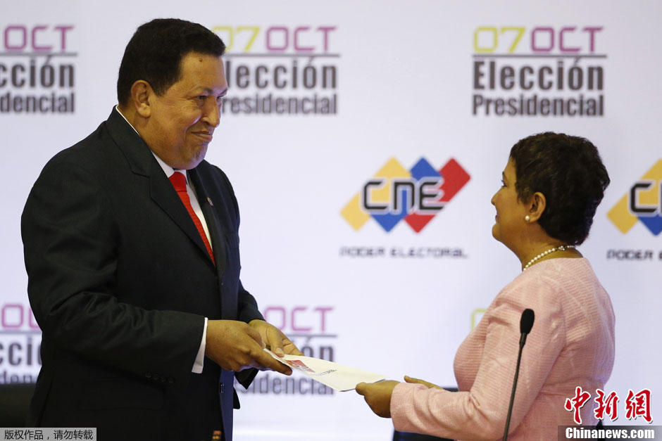 当地时间3月5日,委内瑞拉副总统马杜罗宣布,该国总统查韦斯于当天16时25分去世。乌戈·查韦斯是委内瑞拉第53任总统。他1954年7月28日出生于委内瑞拉巴里纳斯州,结过两次婚,育有一子三女。图为2012年10月10日,委内瑞拉首都加拉加斯,委内瑞拉全国选举委员会正式宣布任命查韦斯(左)为下届委内瑞拉总统,任期为2013年至2019年,并为他颁发了证书。