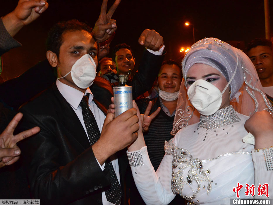 埃及新人骚乱中办婚礼 戴口罩准备催泪瓦斯