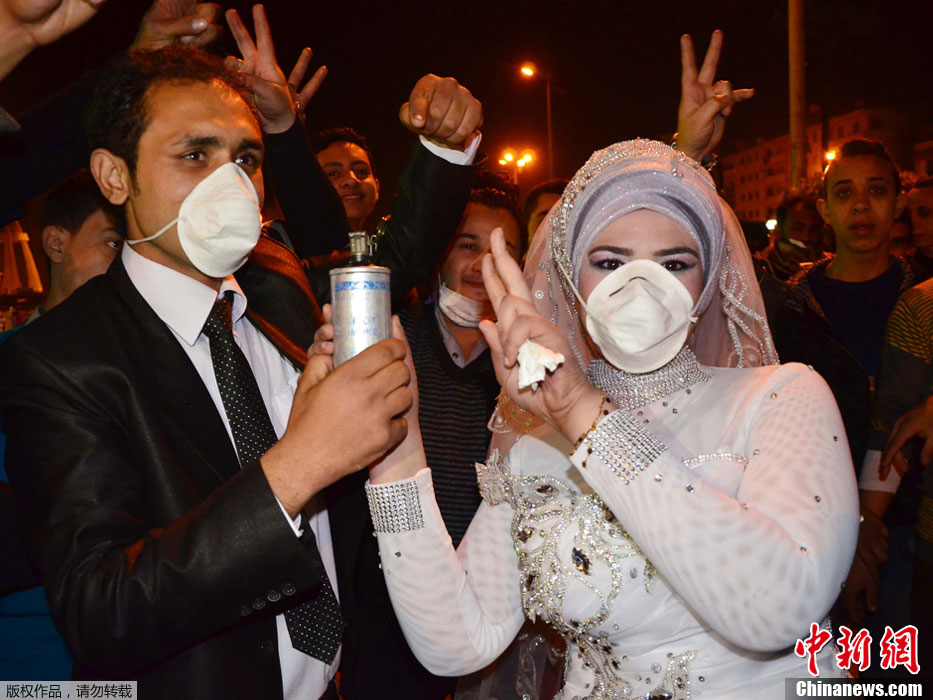 埃及新人骚乱中办婚礼 戴口罩准备催泪瓦斯