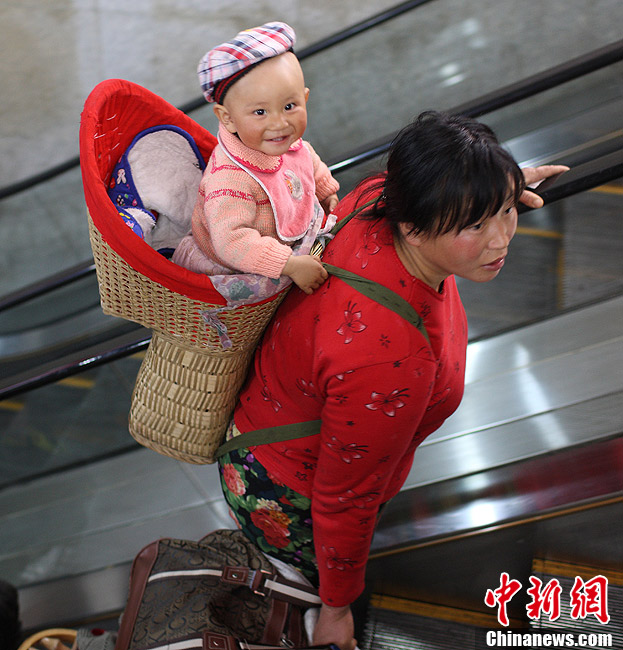 3月6日,一位儿童坐在家长的背篓中从云南昆明乘坐火车抵达江苏南京,随家长返回城市开始新的生活。当日,为期40天的春运迎来最后一天,铁路整体客流逐渐回落。据铁道部网站消息显示,截至3月4日,全国铁路春运期间累计发送旅客近2.3亿人。春运结束后,铁路部门将继续做好临客调整工作,合理安排后续临客开行计划,对客流量大的热门方向临客延长开行时间或加开。中新社发 泱波 摄