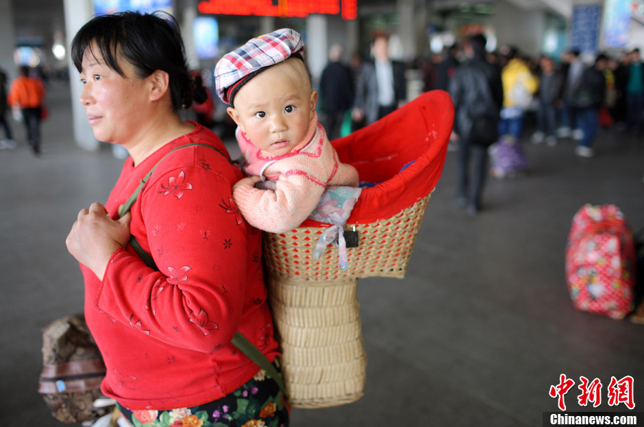 3月6日,一位儿童坐在家长的背篓中从云南昆明乘坐火车抵达江苏南京,随家长返回城市开始新的生活。当日,为期40天的春运迎来最后一天,铁路整体客流逐渐回落。中新社发 泱波 摄