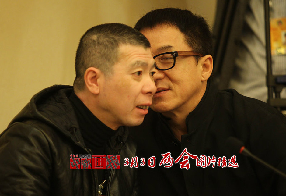 3月6日,北京,全国政协文艺界委员热议政府工作报告。成龙与冯小刚私聊。卢旭 摄 图片来源:CFP视觉中国