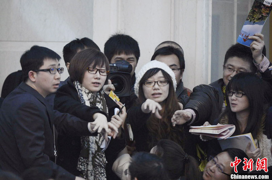 3月6日,人民大会堂重庆厅重庆代表团开放,记者纷纷提问,由于时间关系,记者开始抢话筒争取提问。江心 摄 图片来源:CFP视觉中国