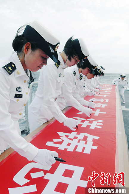 3月7日,距离第十四批护航编队起航近20天,在哈尔滨舰上,有8名作战岗位的女舰员首登亚丁湾,正在参加巴基斯坦“和平-13”多国海上联合演习。作为首批奔赴亚丁湾战斗岗位的女水兵,他们的学习、训练、工作和生活也引起了外界的关注。图为第十四批护航编队女舰员在宣誓仪式上签名。(资料图片)中新社发 李丁 摄