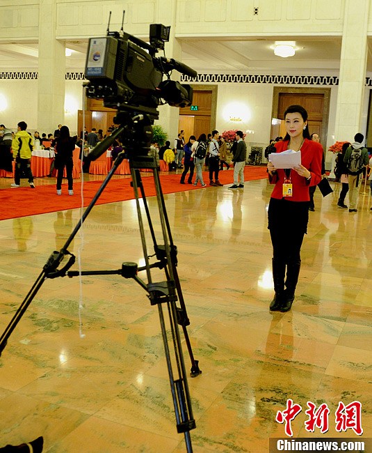 3月7日下午,全国政协十二届一次会议举行第二次全体会议,大会堂内女记者一个人站在摄像机前做直播。中新社发 刘忠俊 摄