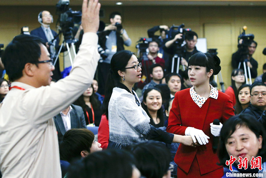 3月7日,全国政协十二届一次会议举行第二场记者会,六位政协委员就“推动科学发展”等相关问题回答中外记者的提问。图为一名女记者正准备拿话筒,工作人员却将话筒递给了她旁边的一名男记者,这是因为主持人说明这个问题要交给境外记者提。中新社发 张浩 摄