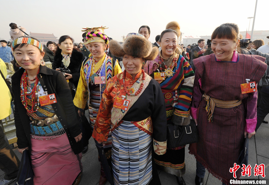 三八国际妇女节恰逢全国两会,女代表、女委员、女记者、女服务员等女性身影活跃在会场内外,格外引人瞩目。图为少数民族代表参会。中新社发 刘忠俊 摄