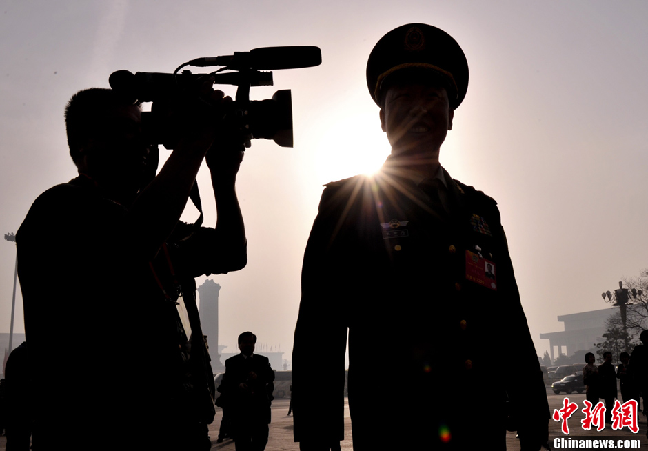 3月8日,全国政协十二届一次会议在北京人民大会堂举行第三次全体会议,解放军委员走过天安门广场。中新社发 贾国荣 摄