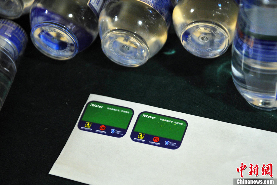 3月7日,两会新闻中心为给水瓶配环保标签,可以写名字做标记,以保证拿水瓶的人把水喝完,不浪费。中新网记者 金硕 摄