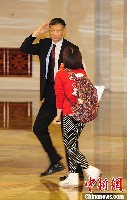 3月8日下午,十二届全国人大一次会议举行第二次全体会议,住建部部长姜伟新在入场途中被女记者“拦截”,他向记者敬礼后匆匆离去。中新社发 侯宇 摄