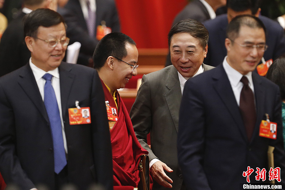 3月8日,全国政协十二届一次会议举行第三次全体会议,16位政协委员分别就充分发挥人民政协作为协商民主重要渠道作用等作大会发言。图为十一世班禅与冯巩委员在会场交谈。中新社发 盛佳鹏 摄