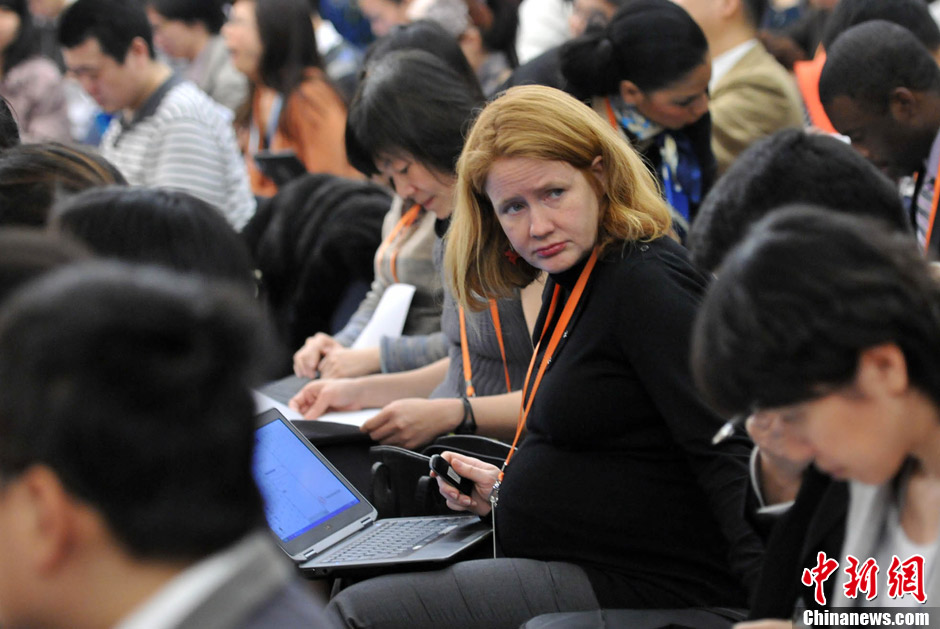 3月8日上午,北京梅地亚中心,商务部部长陈德铭回答中外记者的提问。图为一名怀有身孕的外媒女记者在现场报道。中新网记者 金硕 摄
